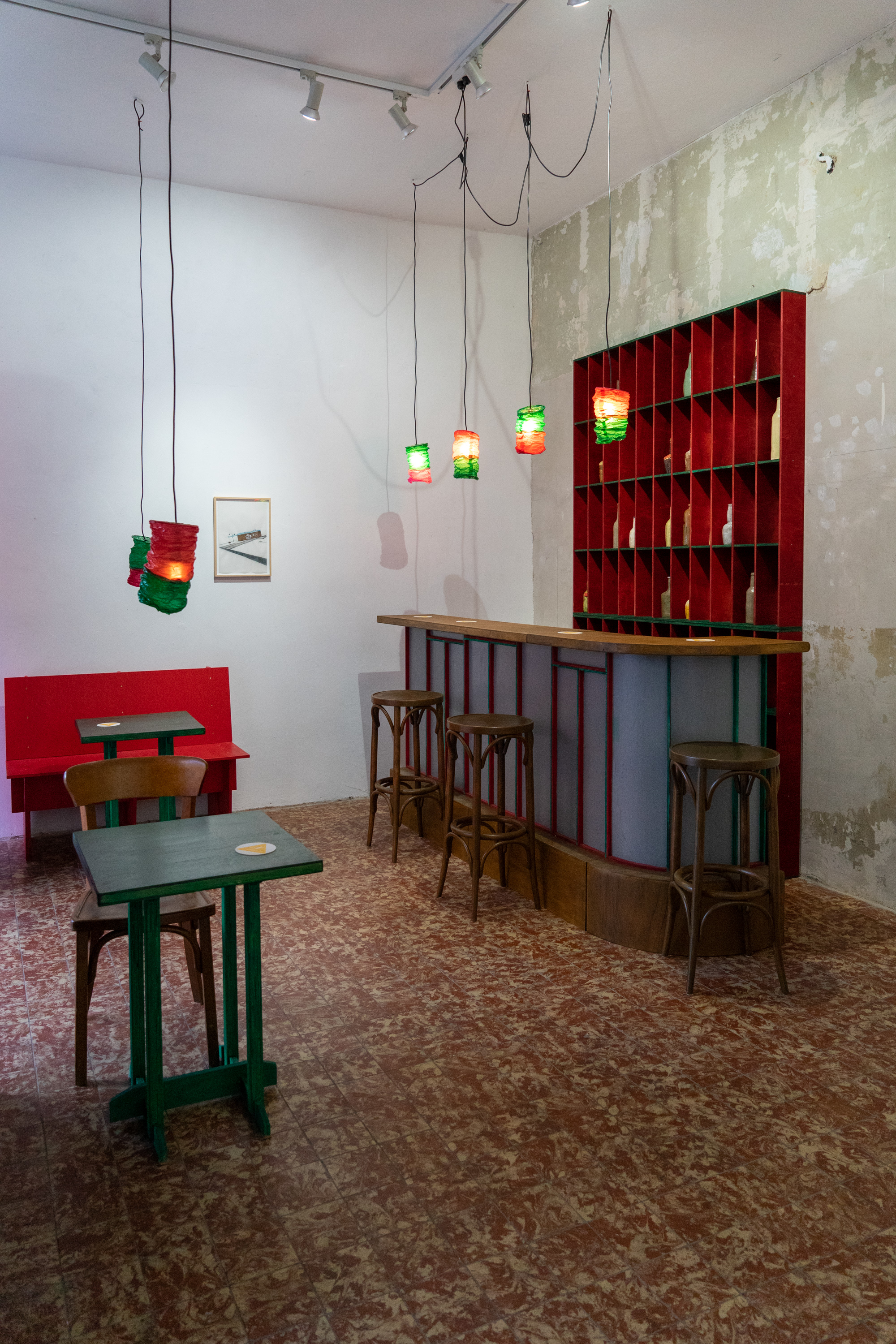 Ina Weber is converting the exhibition space into a bar and is playing a confusing game between art and reality. This particular bar has its roots in France, but can be found in one form or another all over the world. Weber's central theme is the built environment of man, its aesthetics and social dimension. In Provinz she creates a universal image of a social place. Art has a different effect when it is exhibited in a bar. The beer tastes different when you drink it in the gallery. Or does it?